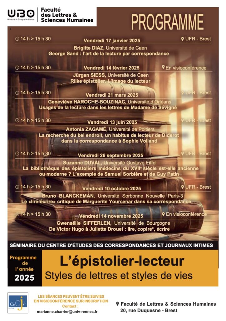 Les séances peuvent être suivies en visioconférence sur inscription, contact : marianne.charrier@univ-rennes.fr.